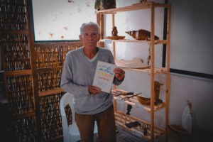 No dia 7 de novembro, o Mini Museu Caiçara e a sede da ACAJU (Associação Caiçara do Rio Juqueriquerê) abriram suas portas para uma visita especial. Com um enorme sorriso no rosto, o Mestre Caiçara Pedro Paes nos recebe na entrada, onde uma placa feita por ele mesmo em mosaico de conchas já anunciava o cuidado e o carinho com o território. O aroma de café coado se espalhava pelo ar, nos acolhendo junto às histórias que fluiam naturalmente na voz de seu Pedro.