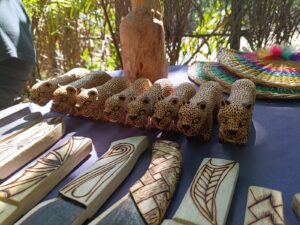 Junto com o viveiro, o coletivo também fortaleceu a prática das artes e artesanatos tradicionais indígenas guarani. Na comunidade Rio Silveiras, eles produzem cestaria, grafismos, brincos, colares e pulseiras. Outra arte muito presente é a miniatura de animais nativos da Mata Atlântica. “Tucano, gavião, coruja, macacos, onça, os bichos da mata atlântica”, exemplifica Adolfo.