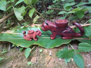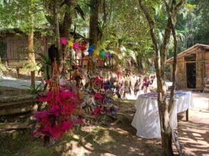 Junto com o viveiro, o coletivo também fortaleceu a prática das artes e artesanatos tradicionais indígenas guarani. Na comunidade Rio Silveiras, eles produzem cestaria, grafismos, brincos, colares e pulseiras. Outra arte muito presente é a miniatura de animais nativos da Mata Atlântica. “Tucano, gavião, coruja, macacos, onça, os bichos da mata atlântica”, exemplifica Adolfo.